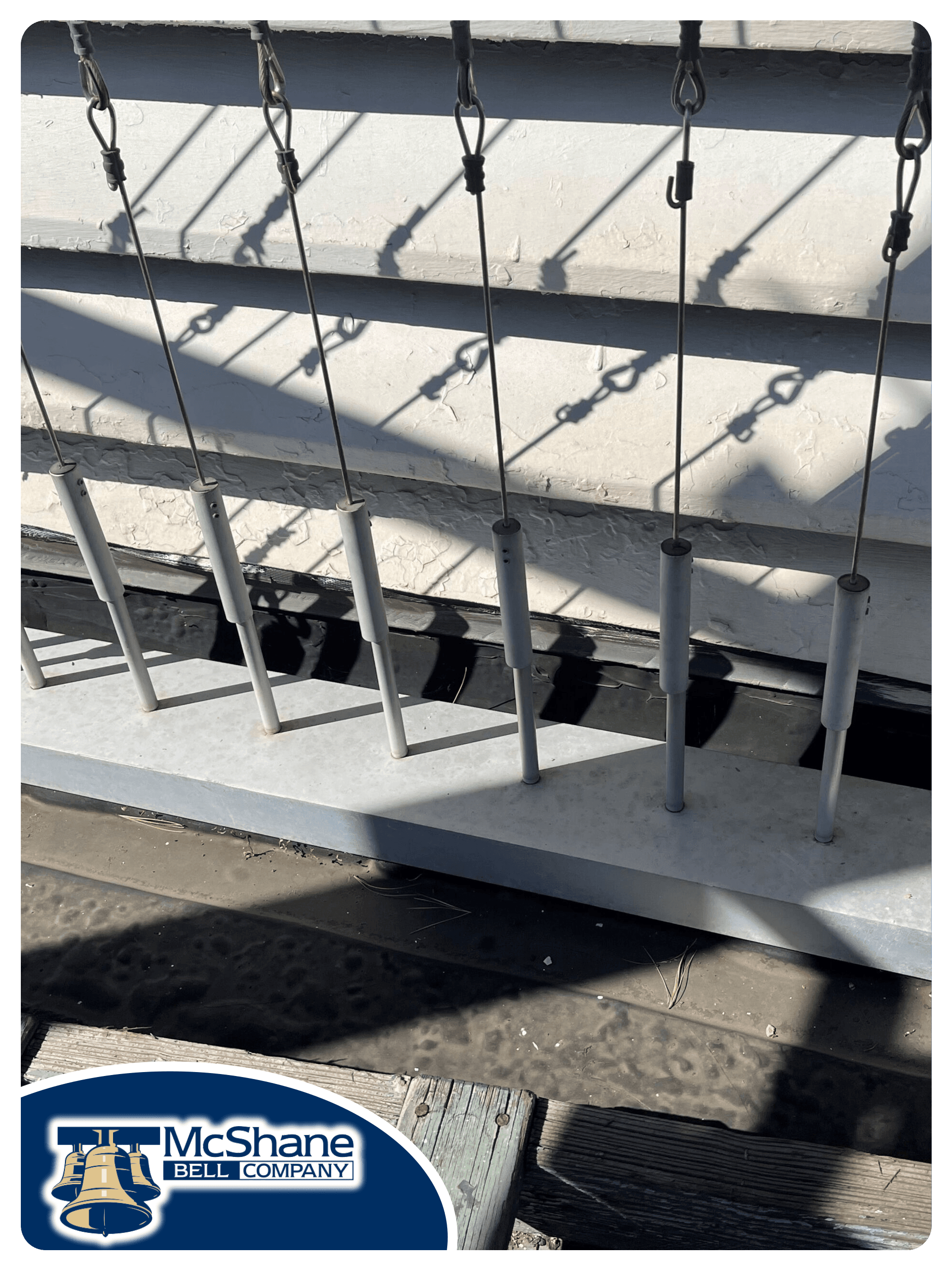 When they called McShane Bell Company, we had one of our installers, do a site visit on October 19th and 20th to explore the feasibility of moving the chime stand down and the structure. We concluded that the cables ultimately would need to stay straight for the best reaction. Before dismantling, the chime stand was labeled to ensure proper reinstallation.