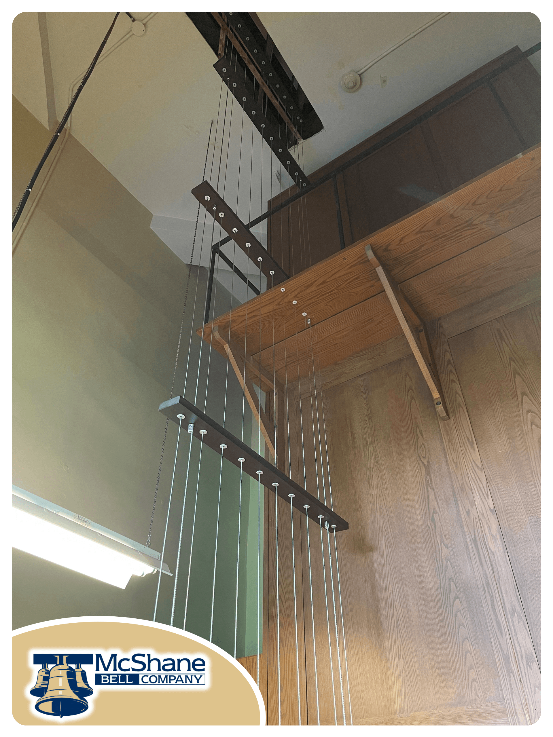 We had to take the chimes apart to move them. We made sure every component was labeled before we dismantled the piece. Each square bolt was removed and placed aside. The individual parts were lowered down to the next level since they were too large to move in pieces by the staircase. The pieces were reassembled on the proper floor, and then, using a laser, we were able to ensure the new cables dropped exactly to the correct position of the chime stand. The cables were directed through stained wood and nylon bushings to keep everything as straight and true as possible. The chime stand was then bolted into place and is now ready for a new crop of chime masters to play and express themselves on this 100-year-old chime stand.