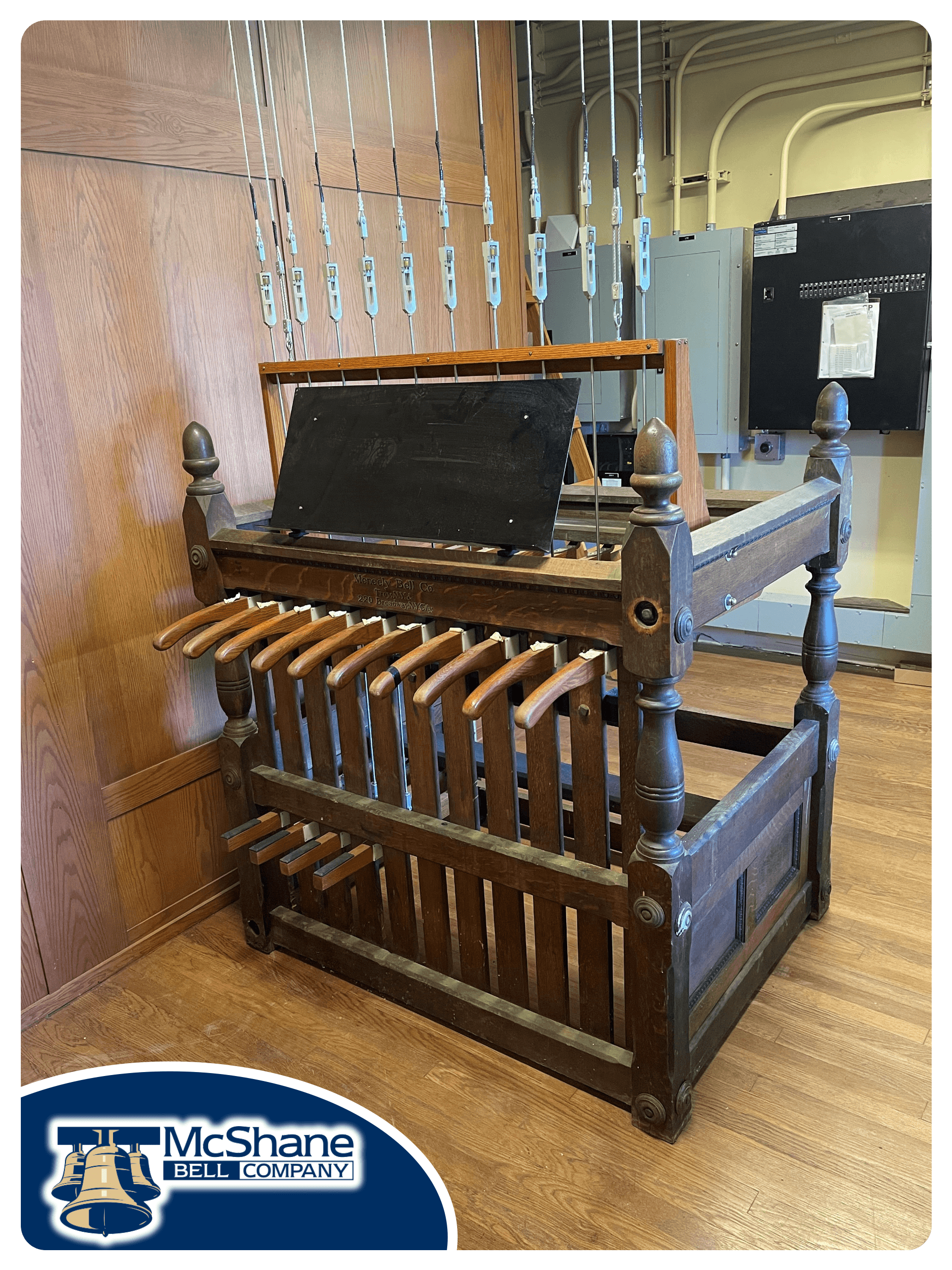 Formerly known as St. Andrew’s Chapel, the Seymour St. John Chapel was built in 1924. Atop the chapel, you will find the 10 Meneely bells and a chime stand also built by Meneely to play these bells. The school had the chimes placed on the top floor of the chapel, which meant students had to climb an almost vertical staircase to get up and play them. The engineering department wondered if there was a safer way for the students to play the chimes without having to climb the stairs.